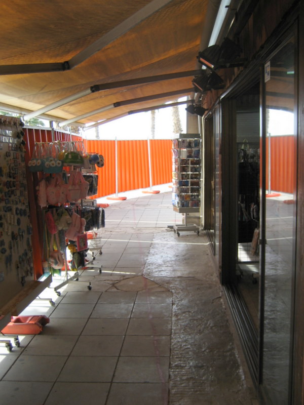 | Sunday's sun setting over the road works and the newly opened 'Tea For Two' cafe takes its first customers. | Another week and the base for the new kiosk(?) is laid and the metalwork is being fixed. | At the other end of the promenade it appears that the popular "Τα Μπανiα" restaurant will be renovated. It has been stripped to a skeleton of concrete. |