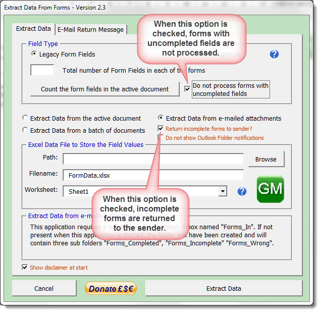 The add-in will cater both for individual forms and for a collection of forms either saved to a Windows filing system folder or attached to e-mail messages. The add-in will handle forms that contain legacy form fields or content controls - but please, not in the same document!