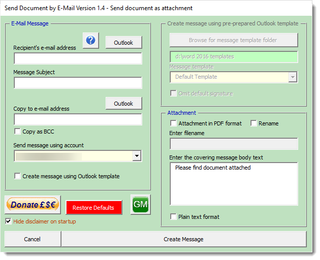 The dialog includes the provision to create the covering message from a pre-prepared Outlook message template, with or without the signature associated with the chosen e-mail account.