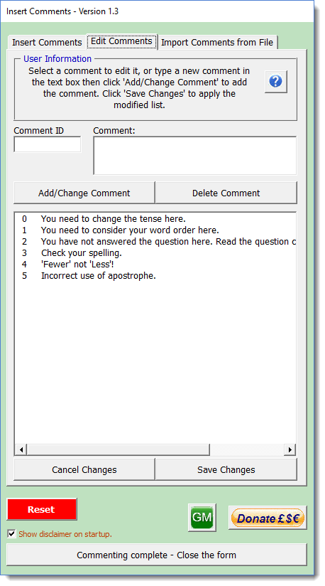 The comments are listed in a list box You may change or delete any of the listed items and/or add your own comments, by making the changes in the text box above. Items may be selected directly in the list box, or by typing the ID number in the 'Comment ID' text box. The ID number is only used to aid editing existing items and has no other significance, other than it needs to be unique.