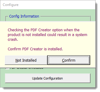 Activating the button for the first time displays the usual disclaimer followed by a configuration dialog so that the user may confirm that PDF Creator is present to allow the selection of protected PDF files.