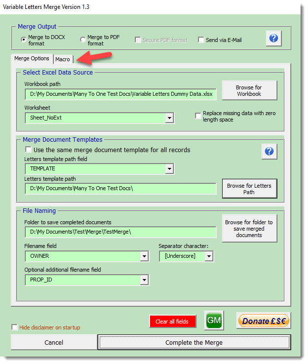 Suggested by a forum post in the lockdown summer of 2021, this page features another type of merge process where the merge document to be used is declared in a column of the Excel data source.